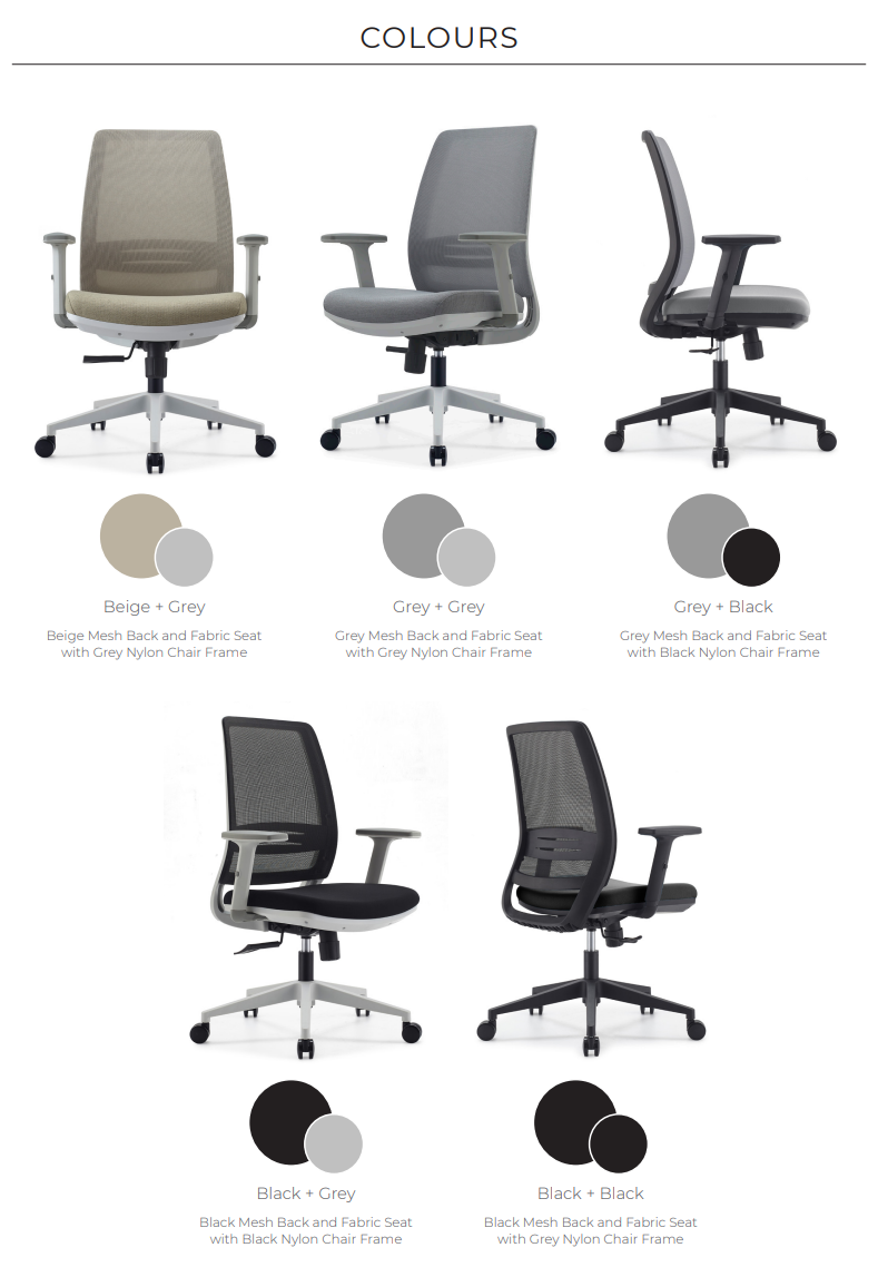 - Mesh Back in Black, Grey, or Beige with Adjustable Lumbar Support